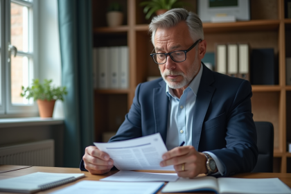 Homme d'âge moyen en costume bleu examinant ses relevés d'épargne